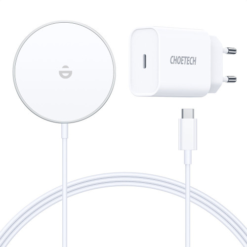 Carregador sem fio Choetech MagSafe Qi 15 W com suporte de alumínio prateado + carregador CA PD 20 W (H047 + Q5004)